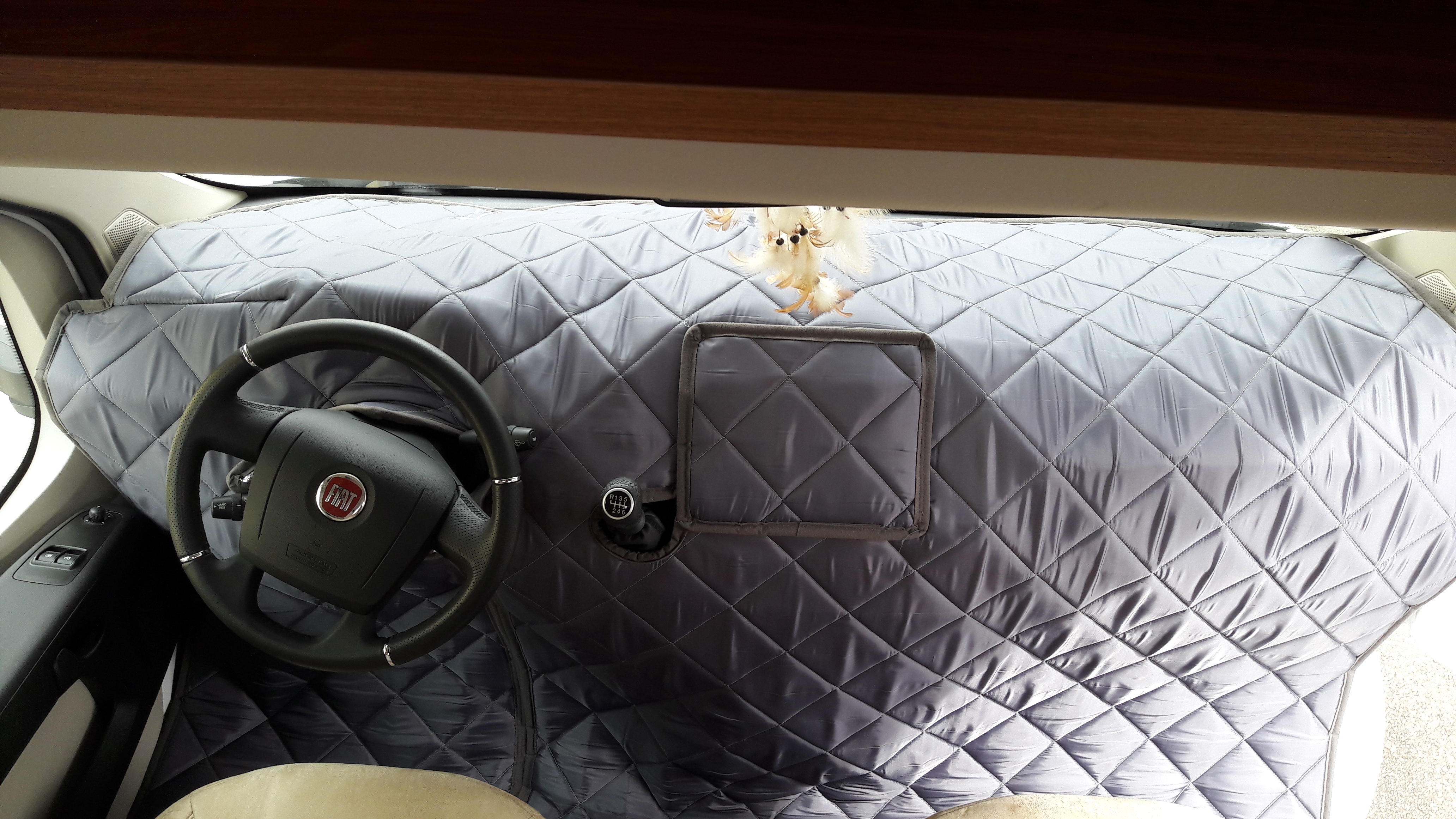 Isolierung ausbreiten, Lenkradöffnung aufmachen und um das Lenkrad führen, Lenkradöffnung wieder schließen.